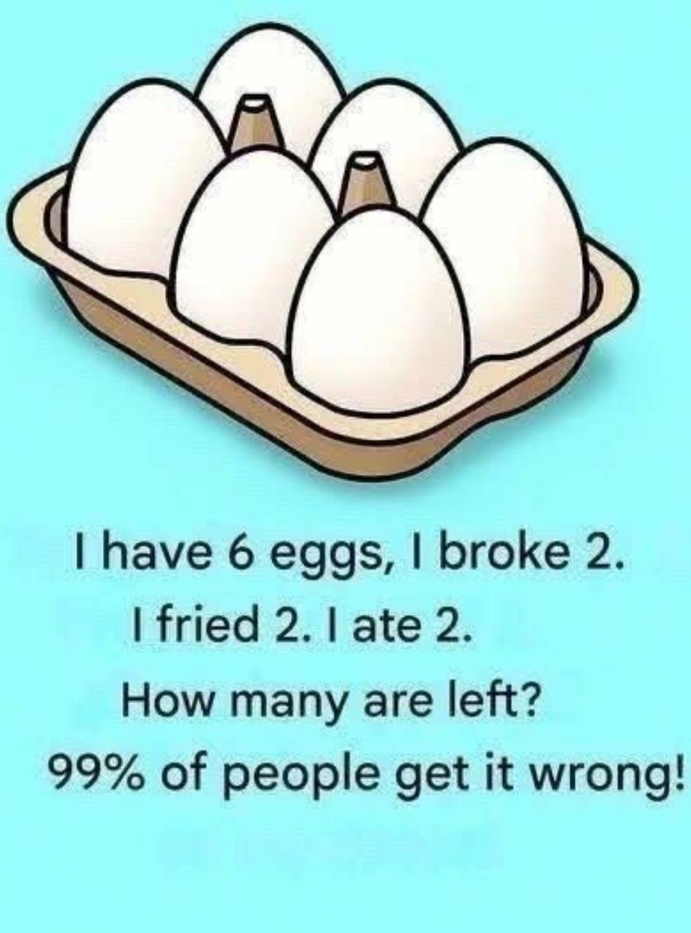 “I have 6 eggs. I broke 2, fried 2, and ate 2. How many eggs are left?”